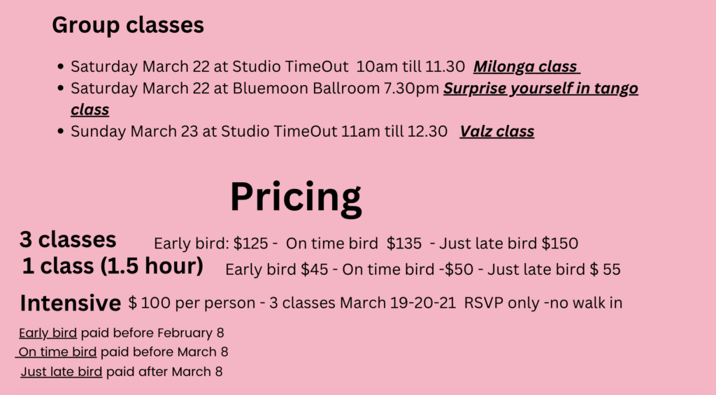 Grand milonga on Saturday evening, will be held in Rochester at the Bluemoon Ballroom. It is a black and white event, with wonderful catering, Live tango music AND a performance by Gaston and Gri. info here