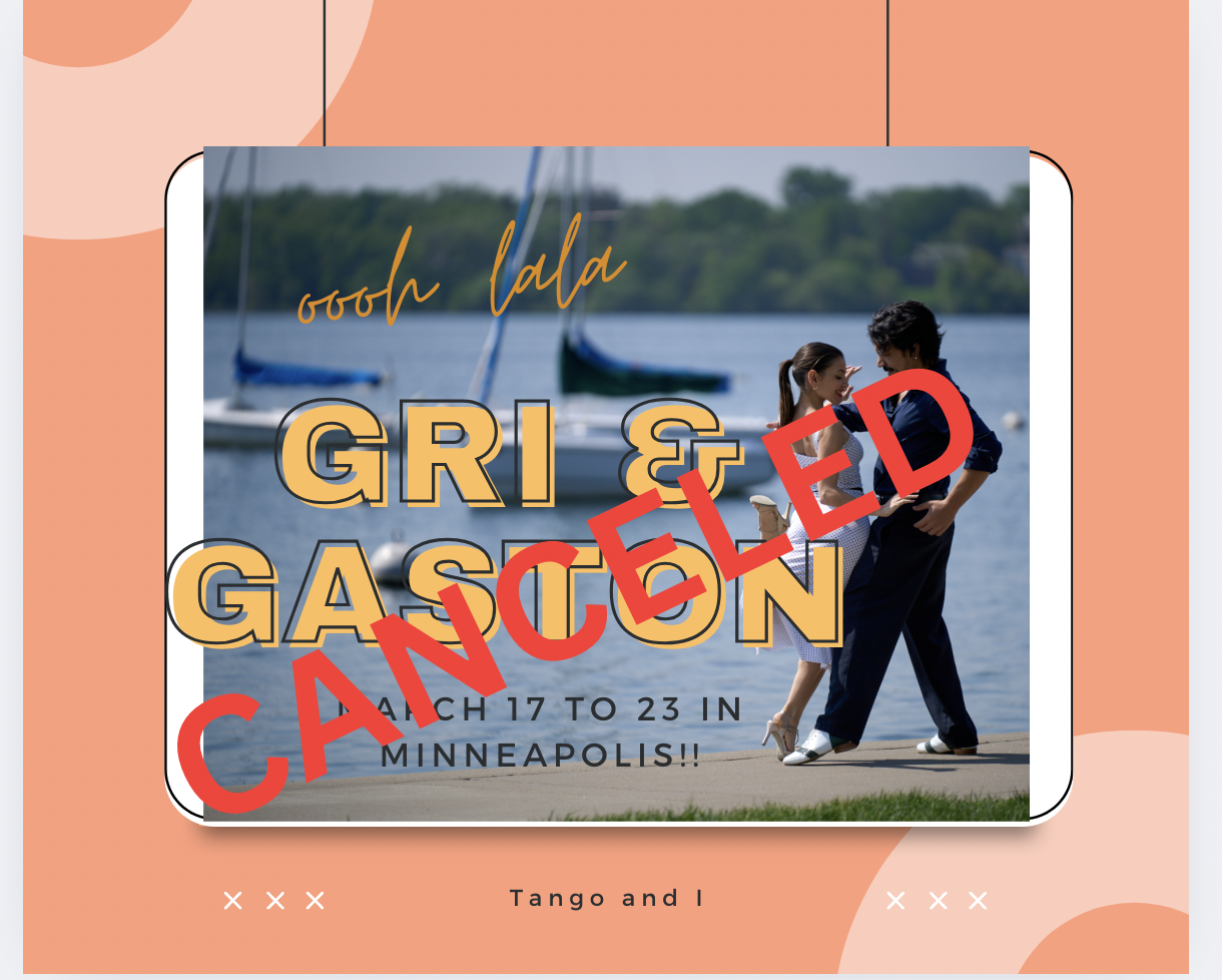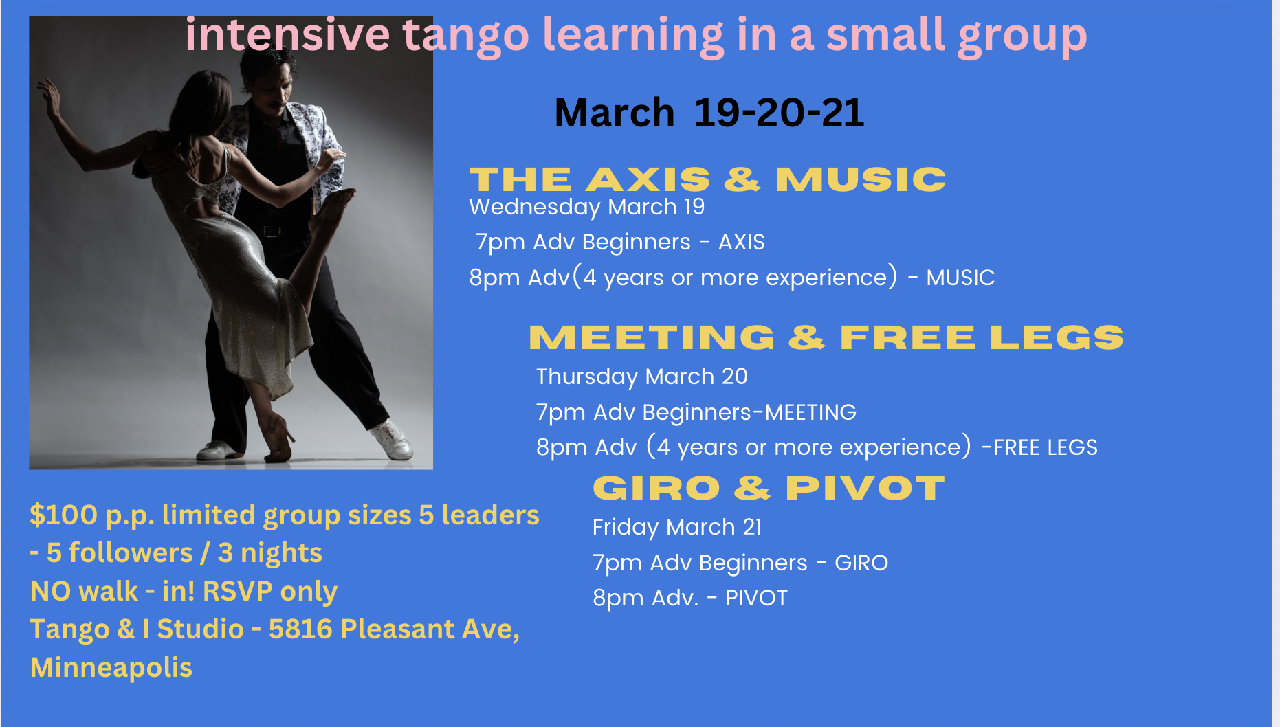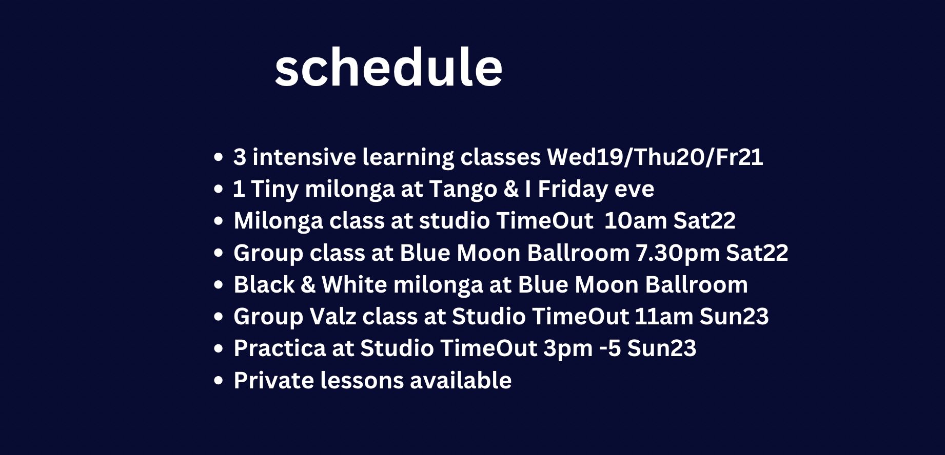Grand milonga on Saturday evening, will be held in Rochester at the Bluemoon Ballroom. It is a black and white event, with wonderful catering, Live tango music AND a performance by Gaston and Gri. info here